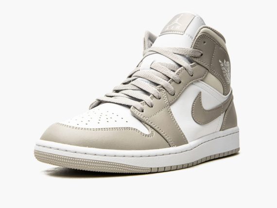 This offering of the Air Jordan 1 Mid comes constructed in a leather build featuring a White base with Tan overlays, Swooshes, tongue labels, laces, and rubber outsole. White continues onto the tongues and midsole to complete the simple design.