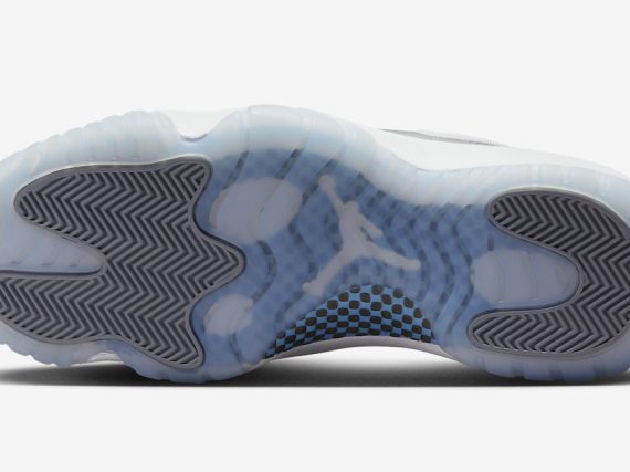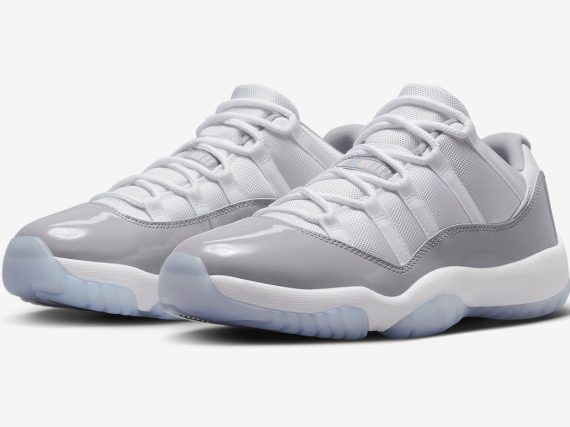 The Jordan 11 Retro Low Cement Grey draws inspiration from the Air Jordan 11 Retro Cool Grey and the Air Jordan 3 Retro White Cement. Jordan Brand used a white mesh upper with a grey patent leather mudguard. The limited edition sneakers are laced with white rope laces and sit on top of icy blue outsoles.