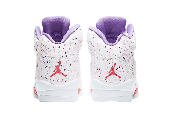 Made exclusively in kids sizing, the Air Jordan 5 Retro GG ‘Easter’ celebrates the springtime holiday with confetti-like specks of color dispersed throughout the white leather upper. Jumpman logo hits in Laser Crimson adorn the tongue and heel, matching the signature shark tooth detailing on the midsole. While the design features molded eyelets and quarter-panel netting, other standard AJ5 details, including the visible Air sole unit and icy rubber outsole, are discarded.